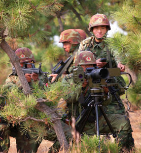 在对“敌”阵地实施了有效的炮火打击和电磁干扰后,战斗进入攻坚阶段。我陆航部队和突击作战部队适时出动。战机轰鸣。10余架某新型改进型武装直升机每两机一组,成尖刀阵形飞临上空。在僚机护卫下,长机迅速攀升高度,随即一个俯冲。两侧火箭弹带着长长的曳尾火光喷射而出。“敌”阵地陷入一片火海。紧跟在后的运输直升机编队迅速接近。舱门打开。突击队员们或绳降、或机降,配合官兵们迅速控制了“敌”要点。