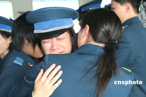 11月24日,济南空军某通信总站为即将退役的老兵举行了庄严而隆重的向军旗告别仪式,老兵们依依惜别。中新社发 耿国庆 摄