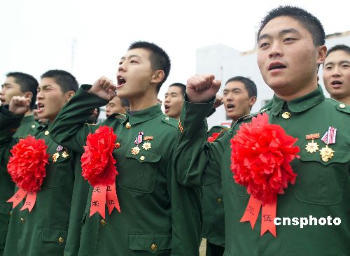 11月23日,武警湖北总队一支队即将退出现役的老兵向军旗庄严宣誓,发扬部队优良传统,永葆军人本色。中新社发 宋建春 摄