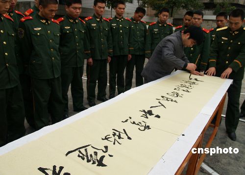 11月22日,武警贵州省印江土家族苗族自治县中队邀请书法家,现场书写并赠送即将退伍的战友。中新社发 陈晓岚 摄