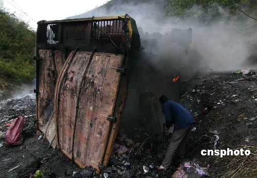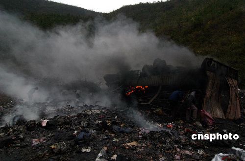 几个村民在翻车起火的车上找没有烧毁的货物。