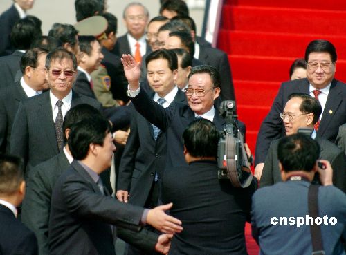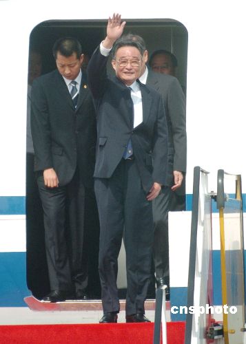 全国人大常委会委员长吴邦国12月2日上午到达香港进行访问﹐在香港国际机场热情的向欢迎人群招手致意,并发表了热情洋溢的讲话。中新社发 宋吉河 摄