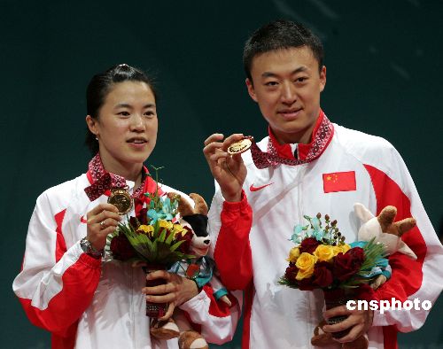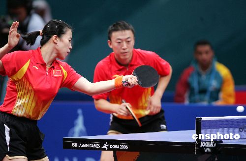 当地时间12月7日下午,中国运动员王楠、马琳获得多哈亚运会乒乓球男女混合双打金牌。中新社发 李刚 摄