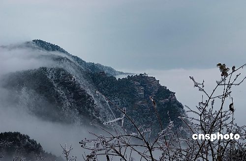 2006年12月10日,庐山出现雾淞与云海同时呈现的景观。每年冬天降雪前,有雾天气又碰到突然降温到零下几度时,庐山会出现雾淞天气,但雾淞与云海同时出现的机会不多。12月10日云海里的庐山,满山雾淞,就像一幅中国画,引来不少游客的惊叹:原来庐山的冬天这么美!中新社发 吴晓光 摄