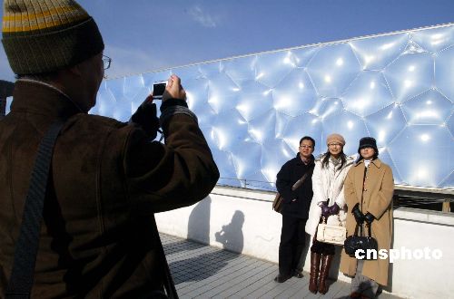 图为台湾青年正在国家游泳中心——“水立方”场馆前合影留念。