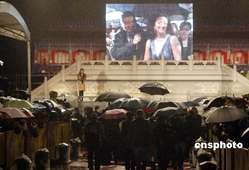 十二月十九日晚,台北大雨如注,张艺谋电影《满城尽带黄金甲》首映礼在台北松涛路一处停车场举行,主要演员周润发、巩俐、周杰伦及“发嫂”陈荟莲共同出席。该片从二十日开始在岛内公映。中新社发 张炜 摄