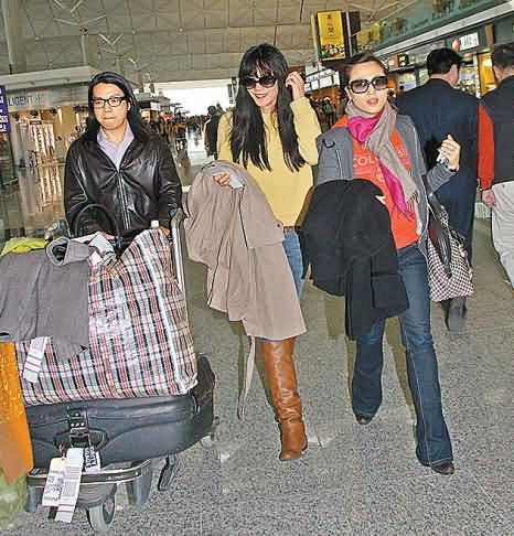 王菲(右)已于昨早飞返北京,形象设计师TiTiKwan(左)为她推着“红白蓝”袋。