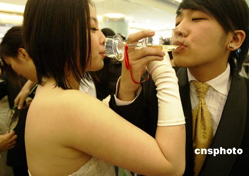 图为新人们在婚庆活动上喝交杯酒。