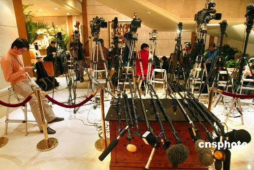十二月二十二日,北京国际俱乐部,各国媒体记者在苦苦等候采访朝核问题六方会谈代表。当日,第五轮六方会谈第二阶段会议在北京宣布休会。中新社发 杜洋 摄