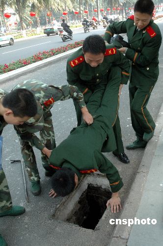 一位消防战士被抬提着把头探进窨井内查看是否有狗被困下水管道。