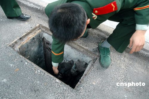 消防战士从窨井口救出被困下水管道的黑狗。
