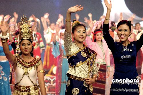 十二月二十九日,几十位美丽的中国东盟“金花”身着“古今中外”服装在广西电视台拍摄晚会节目,该节目将于二OO七年一月六日播出。广西电视台“寻找金花”节目组每年都要把最美丽、最受欢迎的“金花”邀请到南宁进行“美丽聚会”。中新社发 曾德军 蒋雪林摄