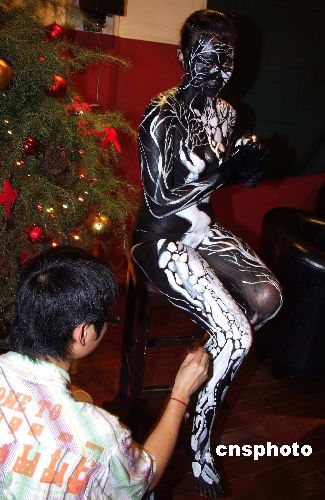 12月29日,由周涌森创始的“鱼子匠弄堂”手工彩绘工房,在上海外滩5号举行激情创始派对。派对在经典爵士的烘托下,由彩绘名师现场演绎了多组人体彩绘作品,一展其艺术家以及综合艺术集约的实力。其主打的中国水墨情韵人体彩绘,获得嘉宾的热烈喝彩。鱼子匠弄堂以现代艺术、民族手工艺、文化交流为创意产品,独特造型每件不同的陶艺彩绘实用艺术品(咖啡杯、烟盅、灯具等)甫面世便获得不少中外人士的订购。中新社发 蒋振雄 摄