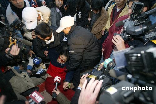 2007年元旦,在台北的“总统府”前广场,一位女性民众因高喊“阿扁下台”,被身旁的安全人员立即架离现场。为防止她再喊倒扁口号,安全人员并一度用毛巾和手捂住其嘴。在架离过程中,该名妇女出现体力不支的状况。中新社发 张炜 摄
