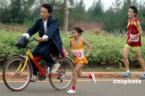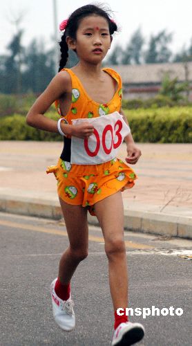 2007年1月1日,2007海口第五届“极限长跑杯”马拉松赛举行,130多名自愿报名参加的男女以自己喜爱的长跑方式迎接新年的到来。再过6天就满8岁的女孩张慧敏3小时28分45秒跑完全程,比女子组第一名(成人)仅多用时19秒。赛程从万绿园至海口火车站返回,总距42.195公里。据赛事总监介绍,他们所了解到的此前世界上跑完此标准距离马拉松赛程年龄最小者是印度一名9岁男孩。中新社发 善平 摄