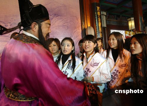 1月3日,正在河南参加首届“中华旅游小姐中国区总决赛”的40位佳丽来到开封参观游览,佳丽们兴趣盎然地参观了古都清明上河园、开封府景区。图为开封府大堂上“包公”与众佳丽交谈。中新社发 钱兴强 摄