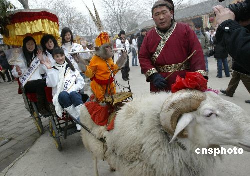 图为清明上河园里别具特色的猴子赶羊车吸引佳丽。