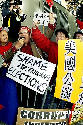 当地时间一月八日下午,数百名代表旧金山、洛杉矶等多个大城市的一百多个团体集聚在圣瑞吉斯酒店门前,抗议美国政府允许陈水扁经旧金山转机,痛斥陈水扁“台独”及贪腐行径。中新社发 陈钢 摄