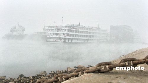 2007年1月18日,大雾封锁长江湖北宜昌段,船舶停航6小时。宜昌港客运码头待闸的船舶在雾中若离若现,呈现雾市城楼的奇观。中新社发 韩玉洪 摄