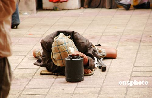 连日来,在广东茂名市河东市场旁有一个头蒙着一条毛巾双脚祼露的中年男子在地上不停地向行人乞讨。 1月19日10点钟左右,市场上的人渐渐的少了。该男子爬行到市场里的一个楼梯口,他突然直起身脱掉蒙在头上的毛巾,快步地走上二楼的楼梯口。该楼梯已停用,堆放着一些杂物。见没有人,该男子从一个塑料袋掏出一条毛巾,动作麻利地擦干净身上的脏物,他警觉地环顾一下四周,迅速地数着乞讨而来的钱。把钱装在一个塑料袋里后走上二楼朝着市场的另一个出口走去。在市场出口前,招手叫来一辆“摩的”价都不问上了车后离开了市场。中新社发 王国兴 摄