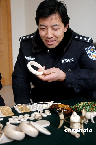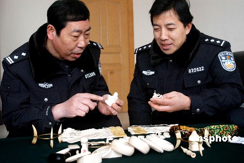 1月22日晚,连云港市交巡警支队治安卡口大队临洪闸警务查报站民警在对一辆出租车进行检查时,在刚从非洲归来的乘客的行李中查出象牙筷子、手镯、雕像等象牙制品79件。象牙及制品是国家严令禁止携带入境的。据了解,这些象牙制品是尚某在非洲莫桑比克工作时购买的,一路上都未被发现,没想到在家门口被民警查获。这也是该市首次查获从境外携带入境的象牙制品。中新社发 王春 摄