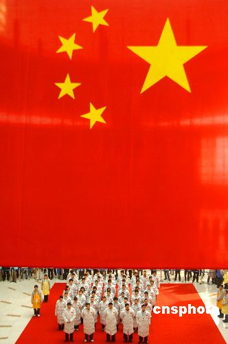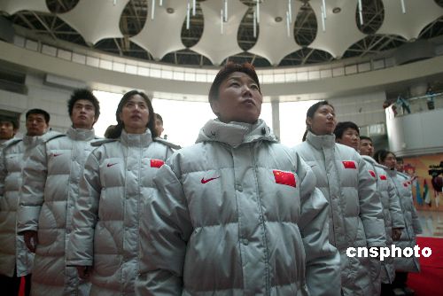 1月28日下午,第六届长春亚洲冬季运动会中国代表团升旗仪式在长春市国际会展中心举行。中国代表团团长肖天、副团长崔大林、蔡振华和中国短道速滑、速度滑冰运动员代表,共40余人出席了升旗仪式。中新社发 廖攀 杜洋 摄