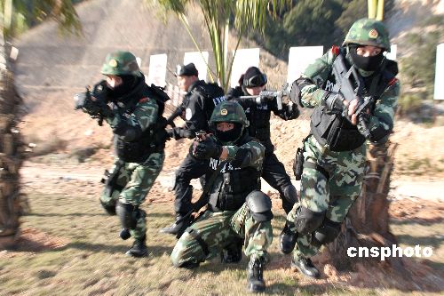1月29日,福建省三明市公安特警、武警在三明市公安训练基地举行处突反恐综合演练,以提高应付和处置突发事件的综合能力,确保春节期间遇有情况能拉得出、打得赢。中新社发 李涛 摄