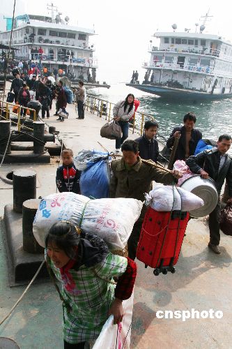 返乡过节的三峡库区民工在重庆市云阳县港务站码头下船。最近几天来,三峡库沿线各港口码头开始热闹起来,从上海、广东、江苏等地务工的外出民工陆续启程回家过春节,形成三峡水路旅客高峰。中新社发 饶国君 摄