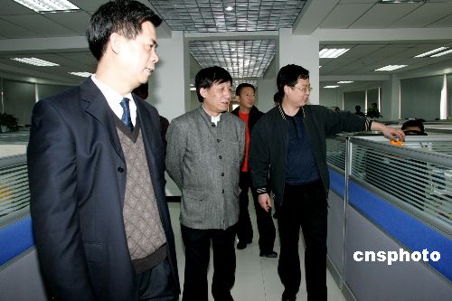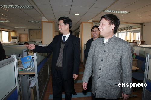 二月五日,北京,厦门大学教授易中天(右)到中国新闻社参观。中新社发 张勤 摄
