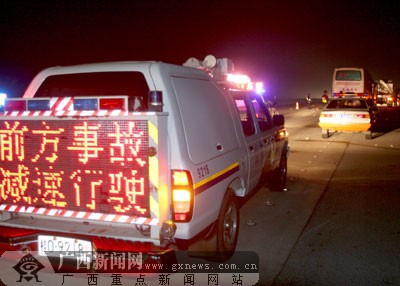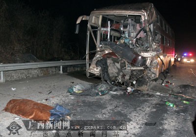2月9日凌晨1时50分,在南北高速公路,一辆载着35名乘客的卧铺客车由广东虎门往南宁方向行驶至南宁市大塘路段时,一头撞上行驶在其前面的一辆大货车,司机当场死亡,多名乘客不同程度受伤。事故发生后,交警、120救护人员迅速赶到现场处置、抢救伤员。事故原因正在调查中。