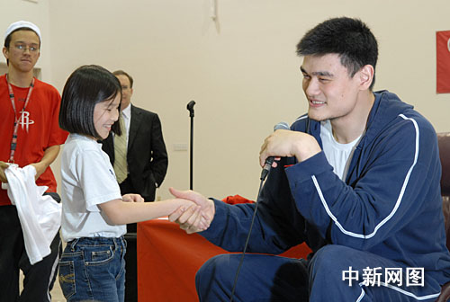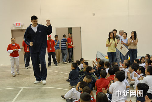 当地时间2月12日下午,姚明来到了休斯敦中华文化服务中心,与这里的几十名少年儿童一道,提前欢庆春节。服务中心理事会主席黄亚静代表该中心赠送礼物给姚明,包括第五届春节园游会海报和一件小挂饰。配合中国年,姚明在自己的NBA宣传册上签名,并且在里面夹放红包一个,赠送给这些小朋友,祝福他们新年快乐。(图片由美国《美中信使报〉/《明桥体育〉提供; 何伟文 摄)