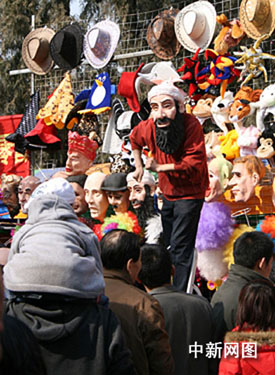 北京地坛庙会上小贩以“拉登”面具招揽生意。秦欣 摄