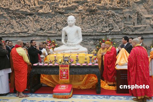 二月二十七日上午,中国佛教协会在北京灵光寺隆重举行“斯里兰卡佛像开光仪式暨佛像供奉祈福法会”,斯里兰卡总统拉贾帕克萨代表斯里兰卡政府向中国赠送一尊禅定印佛像(定中佛)复制品。拉贾帕克萨总统与中国佛教协会会长一诚大和尚一起为佛像揭幕。中新社发 毛建军 摄