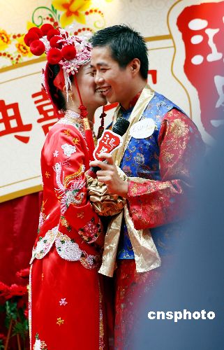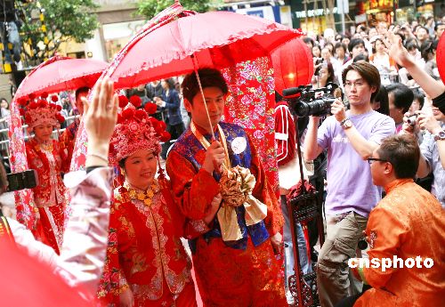 元宵佳节之际﹐香港九对新人在时代广场举行传统集体婚礼。新娘一律身穿传统中式婚嫁裙褂﹑头戴凤冠后佩﹐新郎穿长衫马褂及佩戴绣球﹐在众人的见证下﹐进行拜堂﹑喝交杯酒﹑奉茶等中式婚礼仪式。
