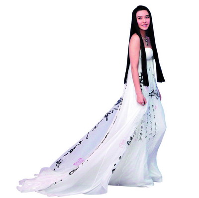 范冰冰和佟大为主演的《苹果》在电影节上虽无斩获,但范冰冰的“美人计”却着实让老外领略了东方美女的风采。这件白色晚礼服的面料轻逸脱俗,裙身上的书法装饰让整条裙子平添了不少含蓄典雅的韵味。