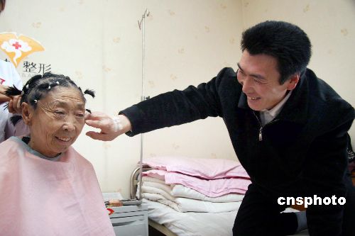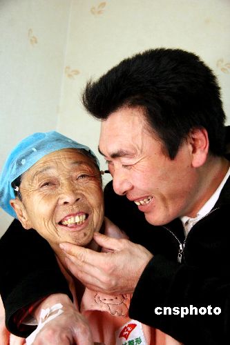 手术前丈夫李玉成关心地抚摸着妻子满是皱纹的脸