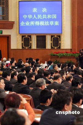 十届全国人大五次会议三月十六日上午在北京人民大会堂闭幕,代表们按表决器通过中华人民共和国企业所得税法草案。中新社发 毛建军 摄