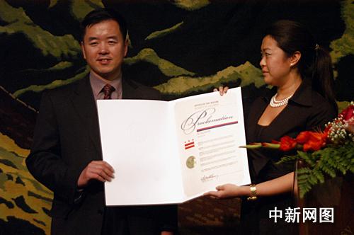 直到离任前几天,邱学军总领事还在关切田纳西州小贺梅回家的事情,这位到任尽一年半的总领事,率领领事处全体同事为华侨华人的事情不停奔走。图为美国首都华盛顿特区市长委派美京中国文化中心斯蒂芬妮·陈为邱学军颁奖。 摄影:邱江波