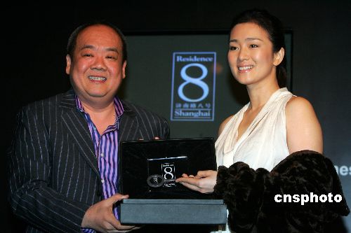 四月六日晚,国际影星巩俐在上海出席某顶级豪宅的揭幕仪式,并成为该豪宅首批入住者。据悉,该豪宅堪称上海年度顶级奢华公寓,每平方米售价为八千美元。图为巩俐(图右)从开发商手中接过公寓钥匙。中新社发 汤彦俊 摄