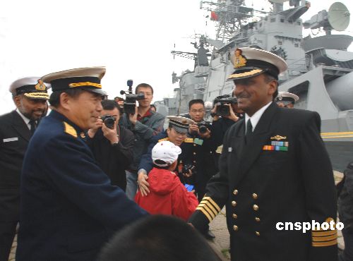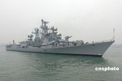 4月12日上午9时,由“拉纳”号导弹驱逐舰(舷号D52)和“兰吉特”号导弹驱逐舰(舷号D53)组成的印度海军舰艇编队抵达青岛,开始了为期4天的访问。随舰来访官兵851人,其中军官61人,士兵778人,非军事人员12人。中新社发 王松岐 摄