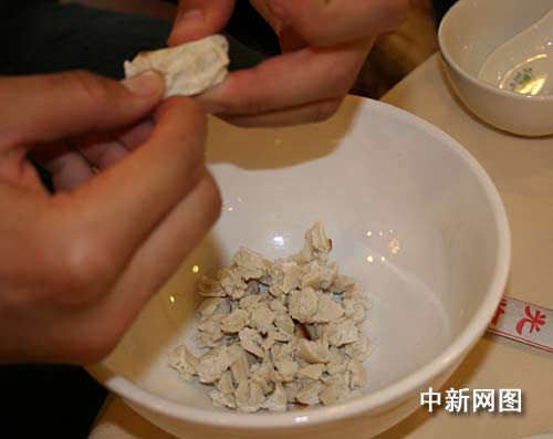 正宗的泡馍是要自己用手这样把馍掰成黄豆粒大小,然后再由厨师加汤。