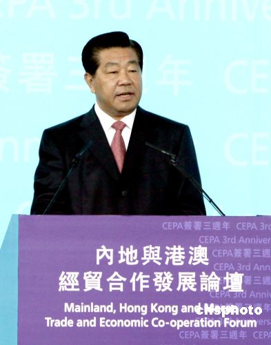中新网香港6月29日电(记者 黄少华)由国家商务部及香港特区政府联合主办的“内地与港澳经贸合作发展论坛”今天上午九时三十分在香港会展中心开幕。全国政协主席贾庆林作题为《深化合作 共创辉煌》的主旨演讲。