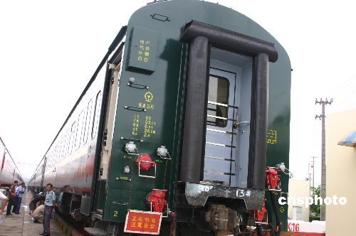 6月30日,停在成都铁路局成都车辆段的T22次进藏客车整装待发。这条“绿色长龙”将于7月1日18时18分从成都始发前往拉萨。据悉,青藏铁路客车是中国自主创新的国产品牌,全部由国内厂家制造。中新社发 杨杰 摄