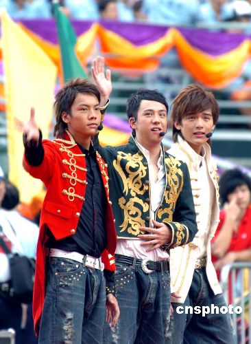 图为音乐组合Boy`Z为大会演唱流行歌曲。