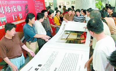 日前在安阳展出的《司母戊鼎》巨书重598公斤,长2.1米、宽1.26米,书中全面记录了安阳殷墟文化的主要内容,是迄今世界上最重的图书,与3000年前先民们铸造的世界上最重的青铜器——司母戊鼎尽显“异曲同工”之妙。在殷墟“申遗”的最后冲刺之时,该巨书的展出再一次向世人展示了殷墟文化的厚重。