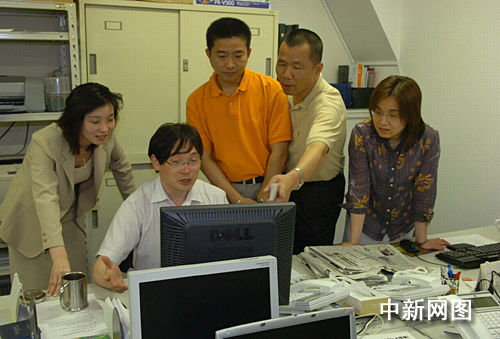 夏春平副总编辑(右二)一行访问《日本新华侨报》社。图为夏春平一行与该报社长吴晓乐等参观该报采编平台。中新社发 王健 摄