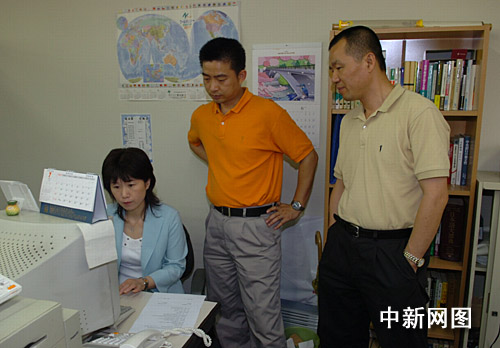 夏春平副总编辑(右一)一行访问《华人周报》社。图为夏春平副总编辑考察该报接收中新社稿件情况。中新社发 王健 摄