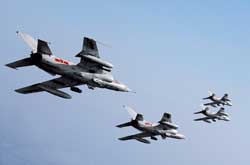 我就坐在高速战斗机座舱里,飞行在数千米的高空,除多了一套拍摄设备外(我携带的是佳能1Ds数码相机,加装一个24—70的镜头,两个1G数码卡,机身内装一个,另一个装在抗荷服漆盖上装地图的小袋子内,机内数码卡容量用尽时,可立即取出小袋内的空卡换上),我的装束和真正的战斗机飞行员毫无二致。我的前舱坐着为我驾机、协助我完成航拍任务的飞行员,身下是无限缩小了的山河大地。我曾无数次在地面拍摄过的战斗机编队,如今凌空霹雳的机群就在我的身旁盘旋游弋。从镜头的纵深望过去,飞行员刚毅的身影依稀可见,银白色的头盔在阳光下熠熠生辉,如同天兵神将在云端穿行,天之骄子九天揽月的威武英姿令人振奋。这就是我在地面上无法看到的飞行员!这就是敢于向生死时速挑战的空中角斗士!一股男儿的血性蓦然从心底涌出。