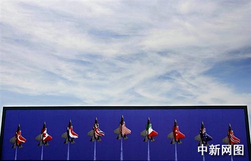 印有战斗机的展示牌在各国国旗映衬下显得格外引人注目。