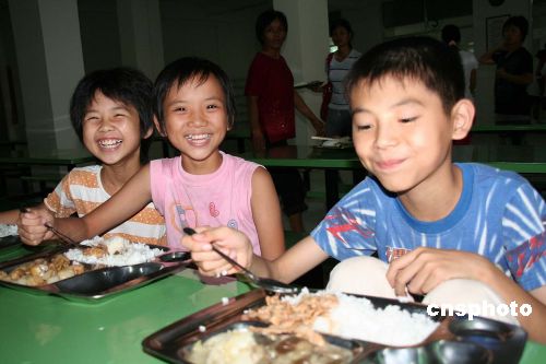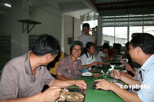 七月二十日,在广东惠州市博罗县高级中学的受灾群众安置点,博罗县罗阳镇上塘村新村小组的六十多个受灾群众正和村干部坐在一起,高兴地吃着可口的饭菜。